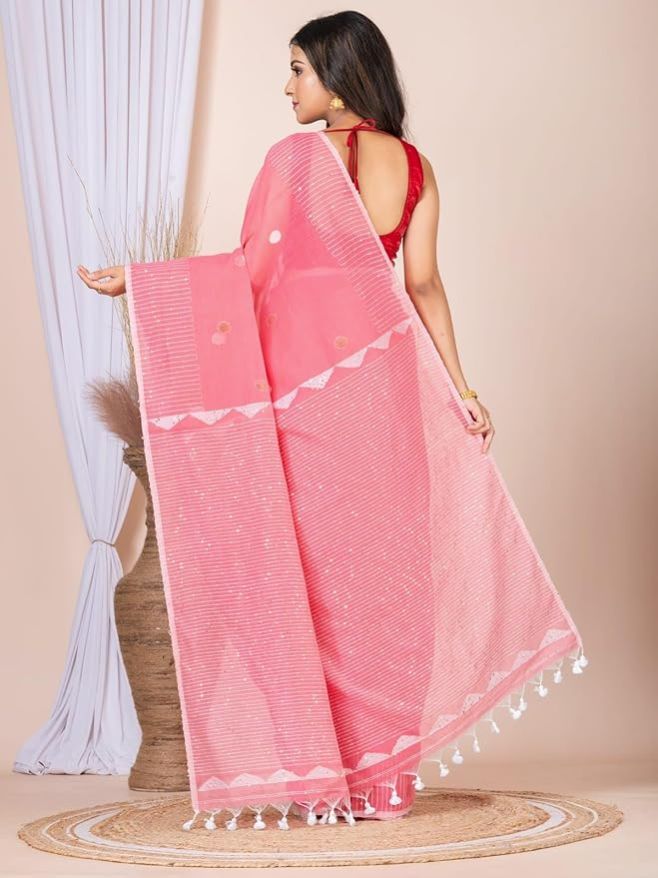 Handloom Maslin Tissue Jamdani | Cotton Silk Saree| Sequins Work on Whole Body|Tassels Attached on Pallu|Blouse Piece Attached.